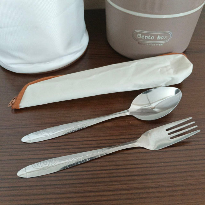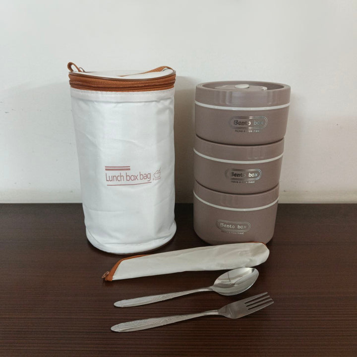 3 Piece Stainless Steel Brown Lunch Box With Foil Bag And Cutlery